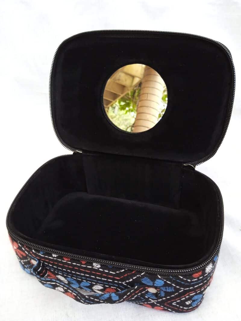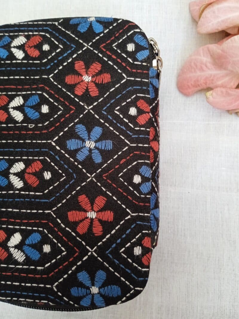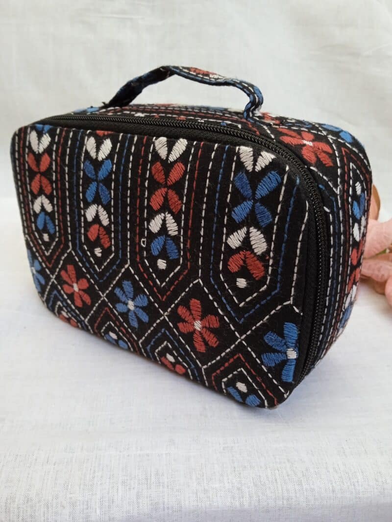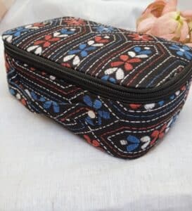 Case to store accessory items, bound in kantha-embroidered fabric.