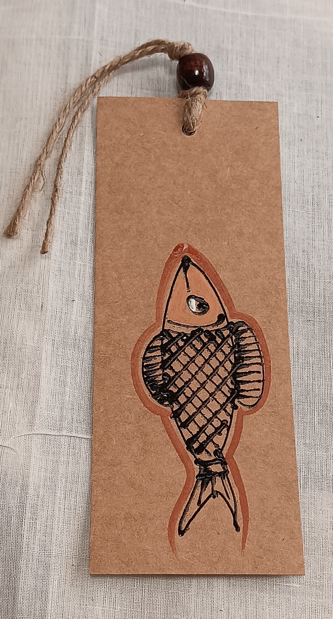 Bookmark made from brown cardboard illustrated with a motif of a ‘Meen’ or fish. A small jute-rope loop and a bead is attached.