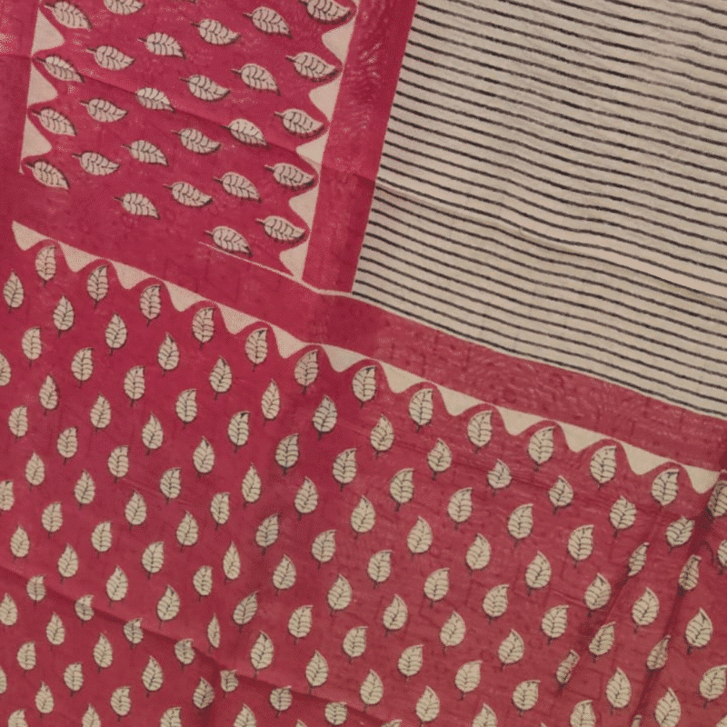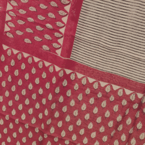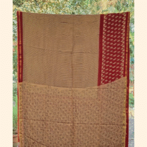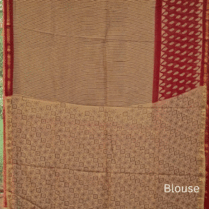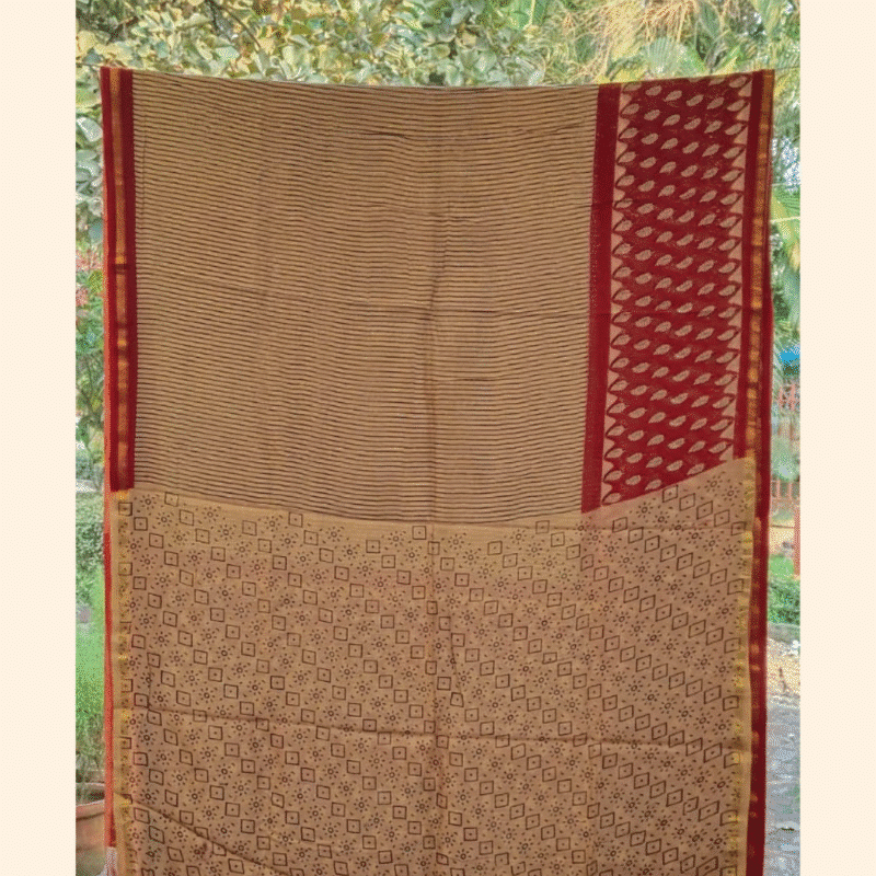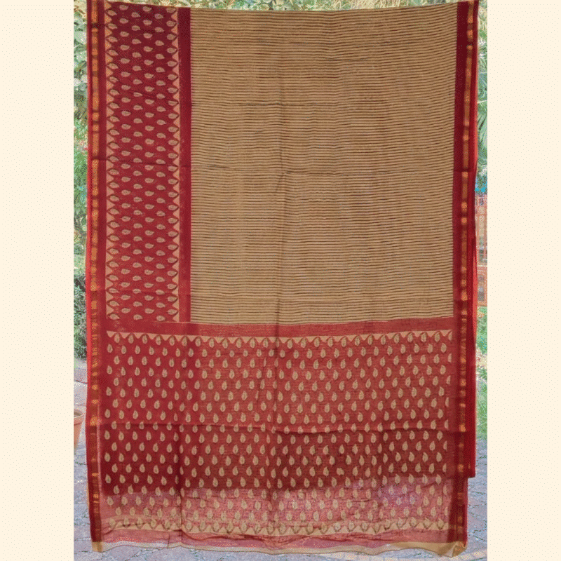 This Chanderi Saree features a beige body with striped motifs, giving it a timeless appeal. The contrasting deep red aanchal and border adorned with beige leaf patterns, adds richness to the overall look. Accentuated with a gold border, the saree beautifully blends traditional craftsmanship with contemporary elegance. Lightweight and naturally lustrous, it drapes effortlessly—perfect for festive occasions or refined everyday wear.
