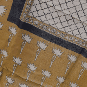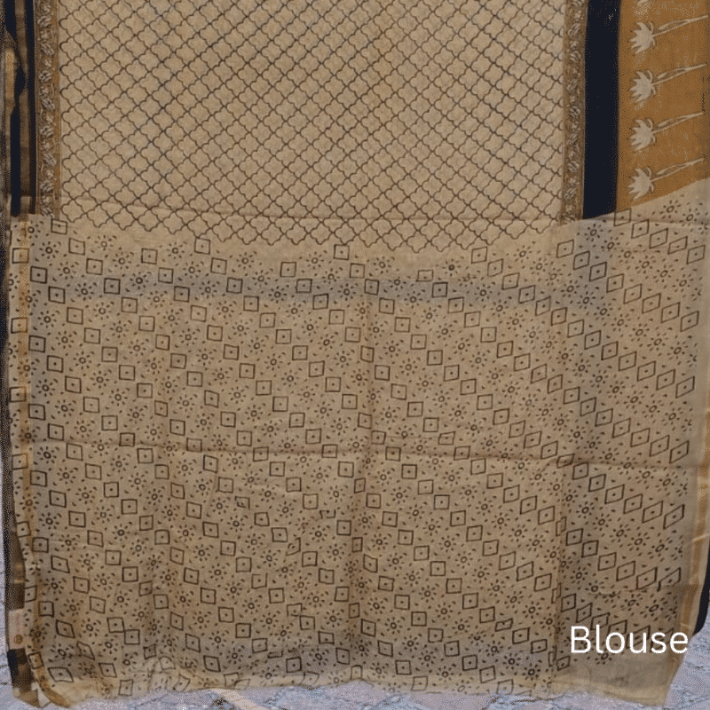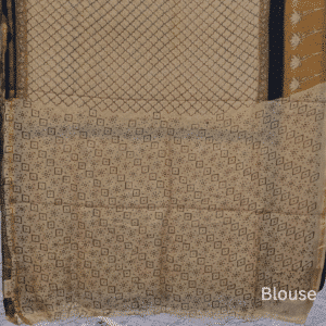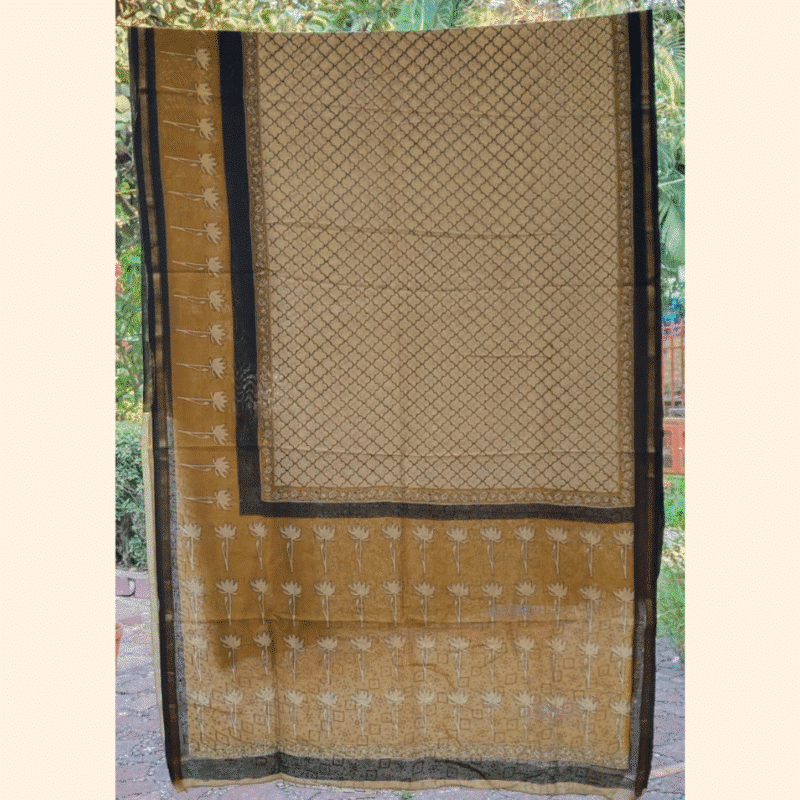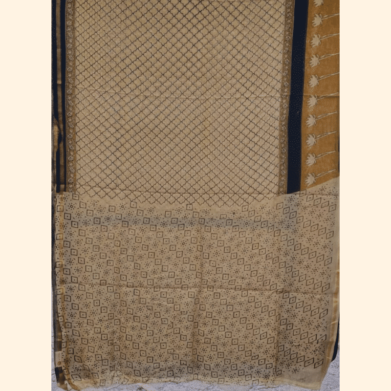 This Chanderi Saree features a refined beige body with delicate lattice motif, giving it a timeless appeal. The contrasting mustard aanchal, adorned with beige lotus pattern adds a graceful warmth and richness to the overall look. Accentuated with a black border highlighted in gold, the saree beautifully blends traditional craftsmanship with contemporary elegance. Lightweight and naturally lustrous, it drapes effortlessly—perfect for festive occasions or refined everyday wear.