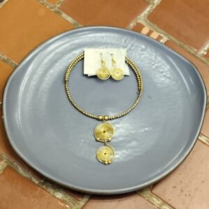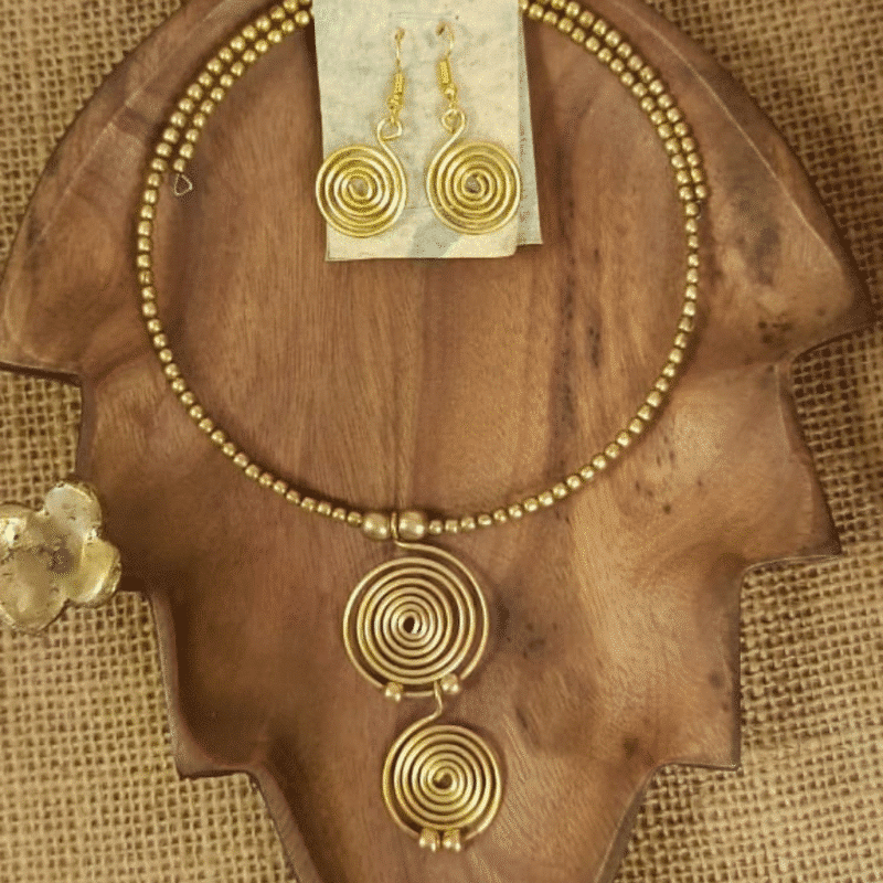 The Double Spiral Medallion Dhokra set is a refined celebration of circular symmetry. Featuring two stacked spiral medallions handcrafted in brass, the pendant is suspended from a choker of fine brass beads.