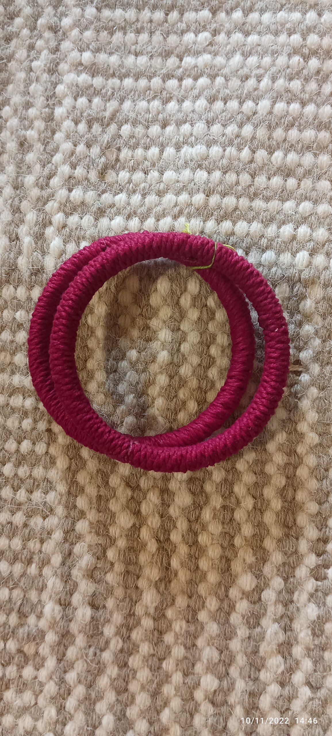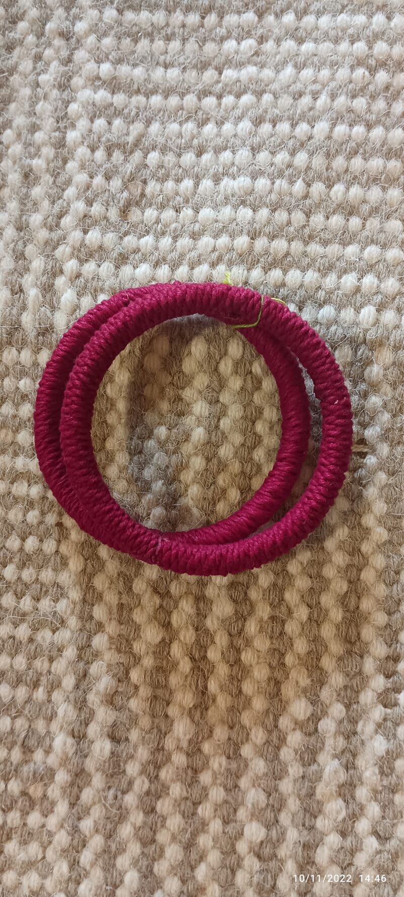 A set of two bangles made from inter-wrapping woolen threads on a circular base ring made from white cardboard paper, by artisans from Santiniketan.