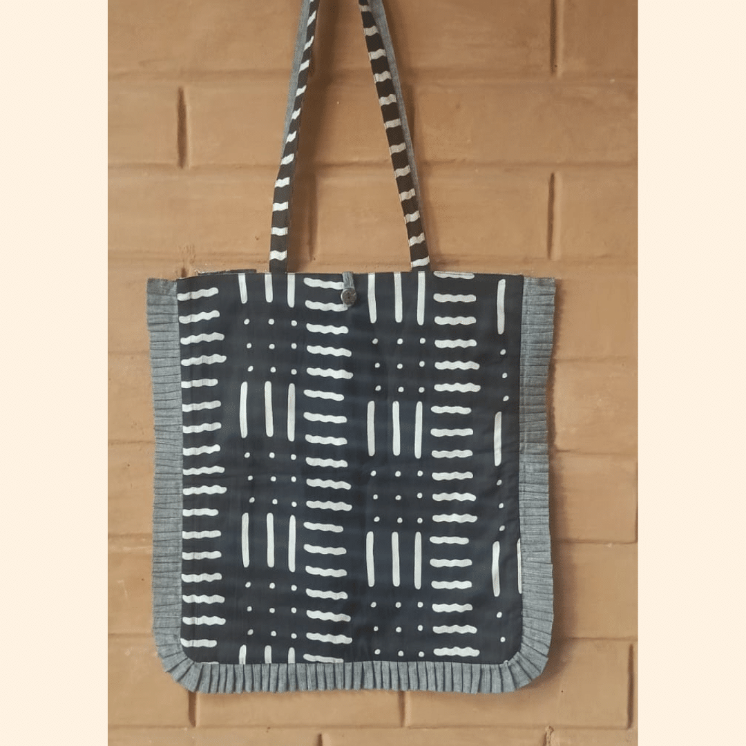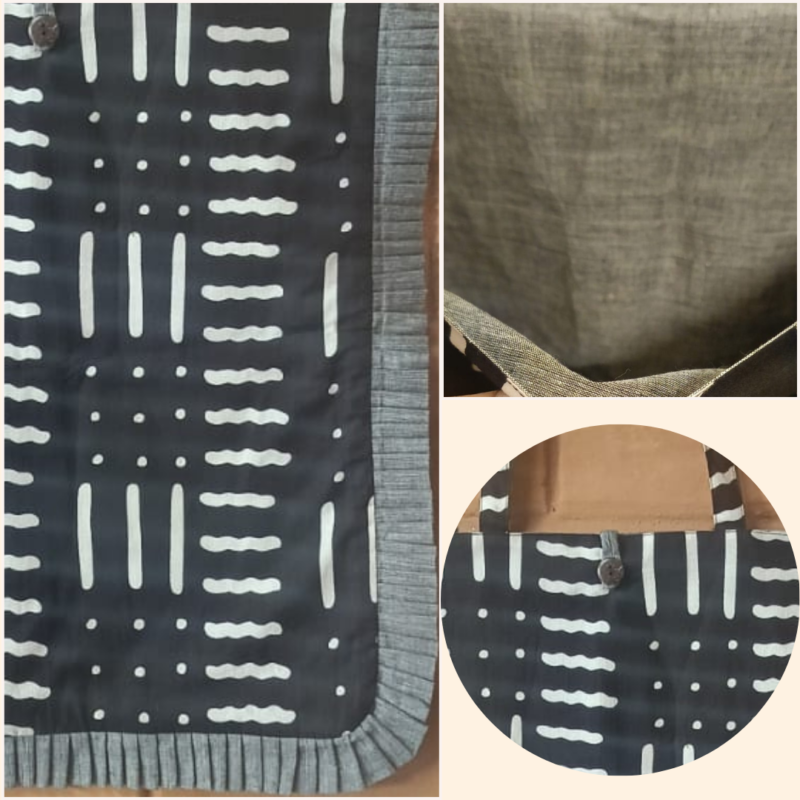 This handcrafted Frill Bag in sturdy cotton fabric, features a bold black base with white tribal-inspired prints, finished with a soft grey frill detailing along the edges. There is a loop with a button and a divider inside for better organisation. It is a versatile accessory that pairs effortlessly with both ethnic and contemporary outfits.