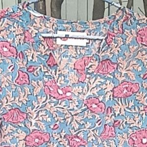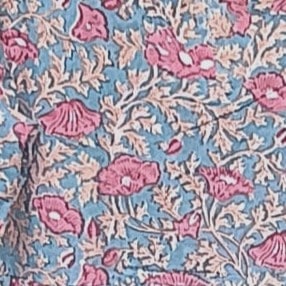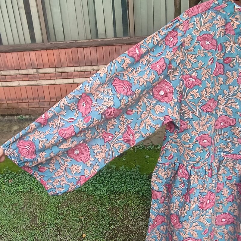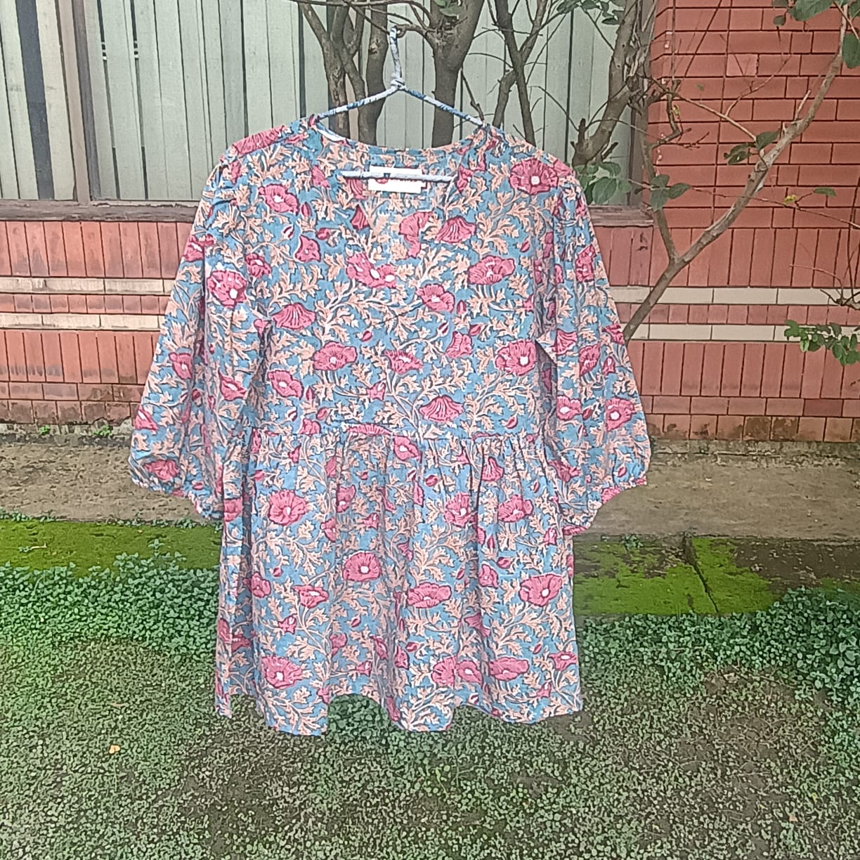 This Gather Top in a muted teal base is adorned with bold floral handblock prints in pink and earthy tones, giving it a vibrant yet balanced appeal. The gathered waistline creates a flattering, flowy silhouette, while the airy cotton fabric ensures all-day comfort. Ideal for casual wear, brunches, or relaxed evenings, it combines traditional charm with modern ease.