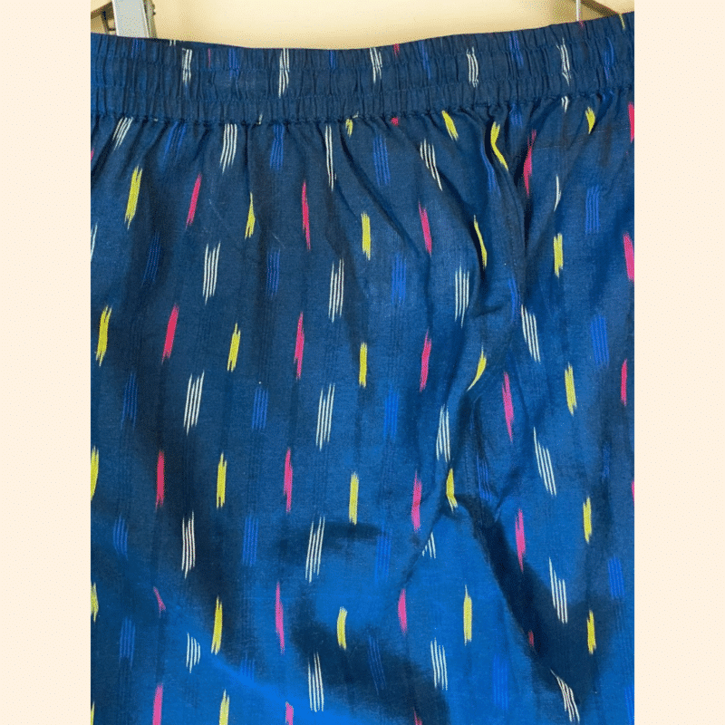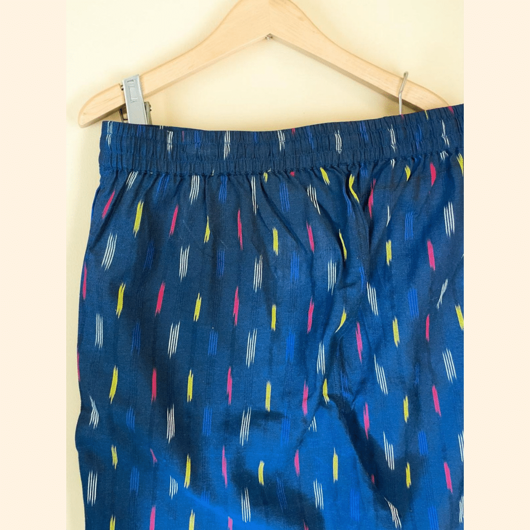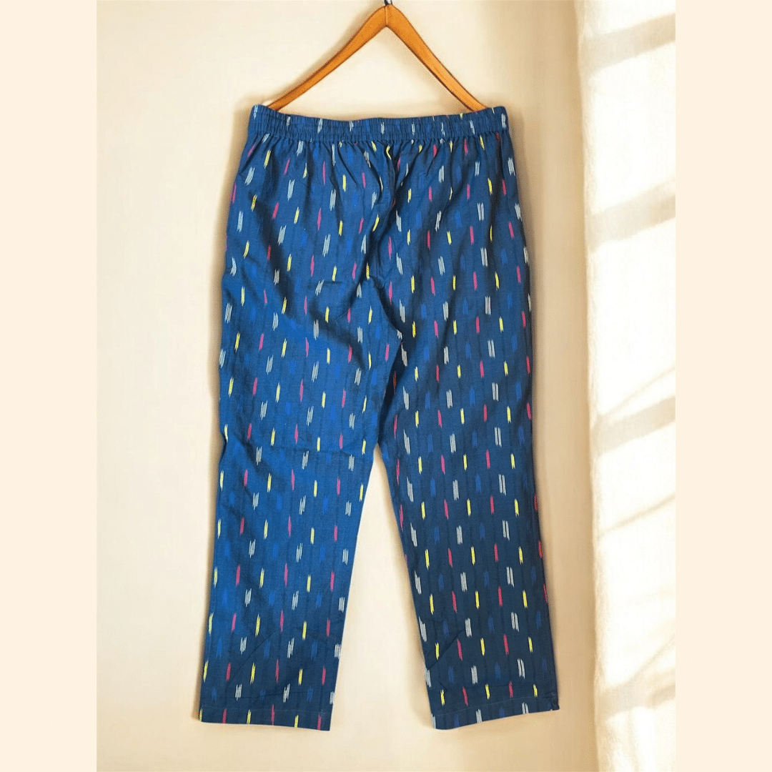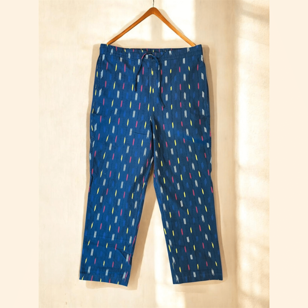 Crafted in breathable cotton, these blue pants feature a classic Ikkat weave punctuated with fine, multicoloured motifs that add just the right amount of character. The silhouette is relaxed and easy, designed for all-day comfort without compromising on style.