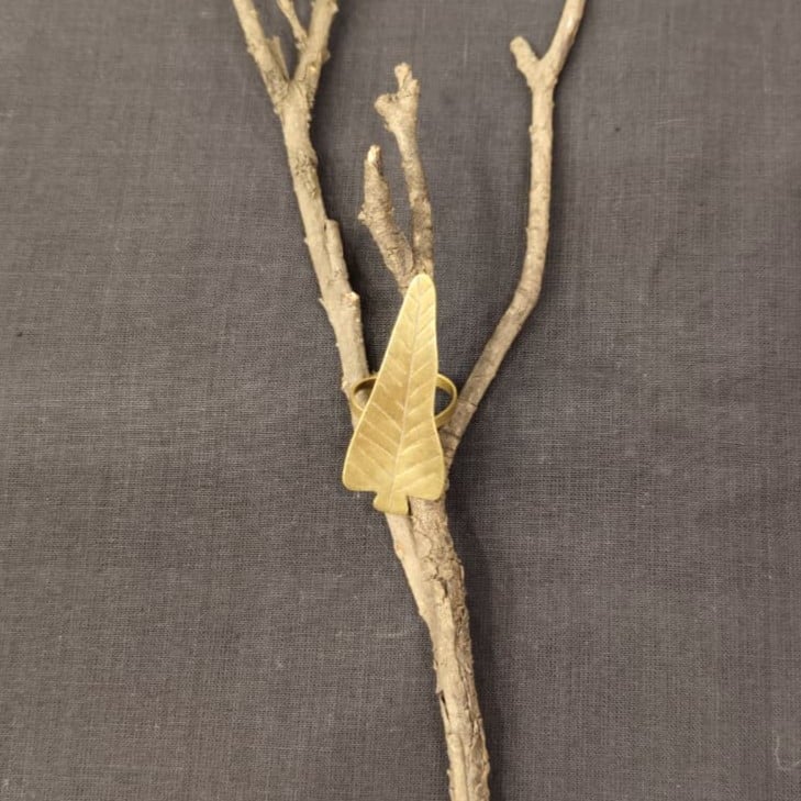 Handcrafted in copper and brass, this adjustable ring features a minimal leaf motif. Its warm golden tone and simple form make it an easy accent for both ethnic and contemporary styling.