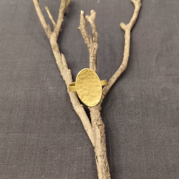 Handcrafted in copper and brass, this adjustable ring features a minimal oval-shaped motif. Its warm golden tone and simple form make it an easy accent for both ethnic and contemporary styling.