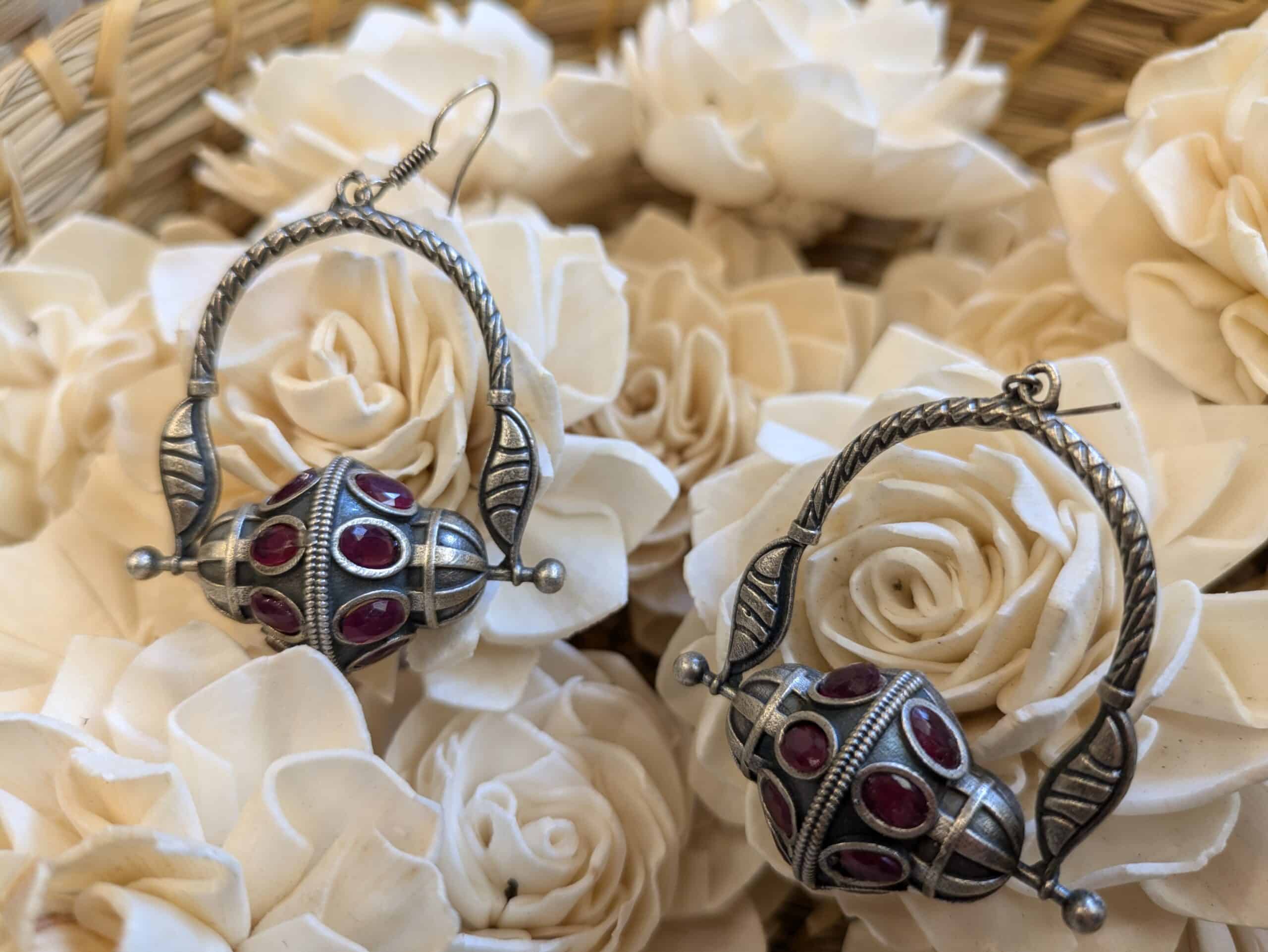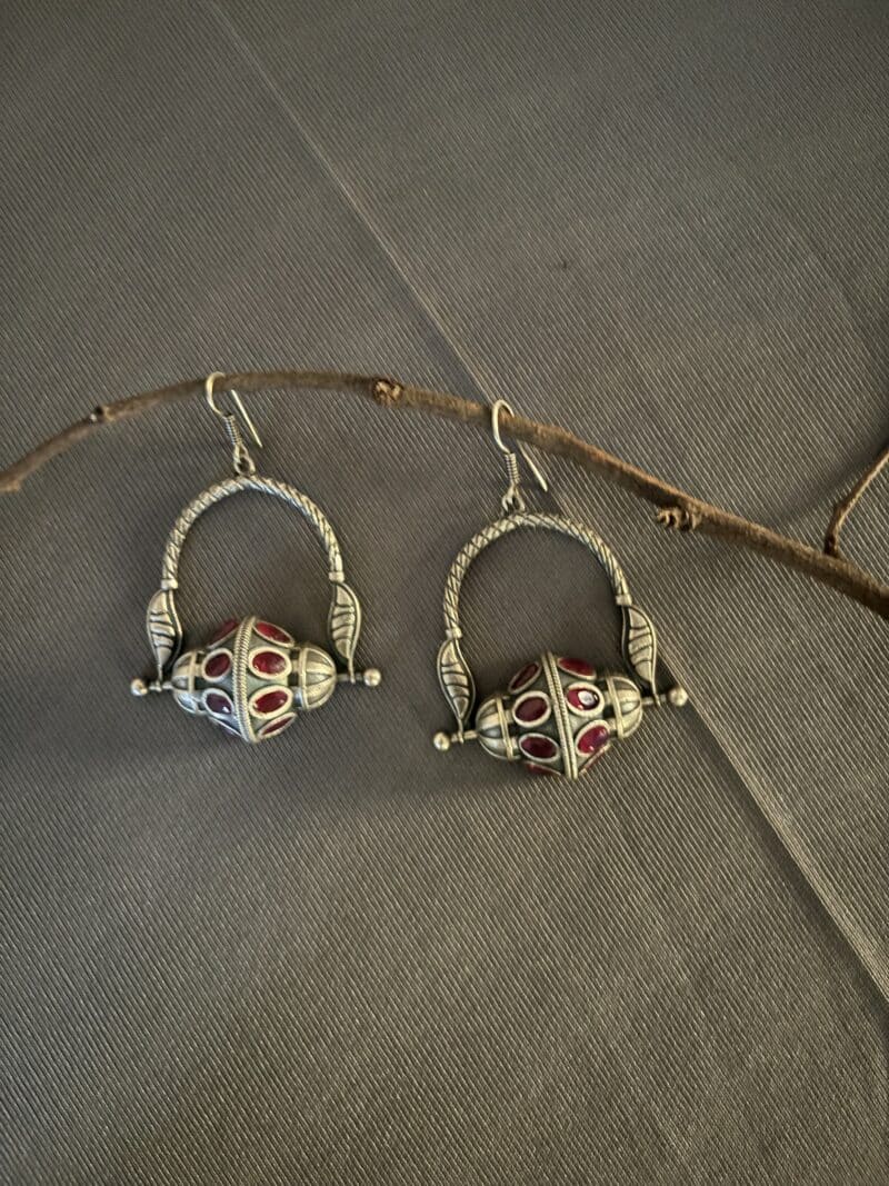 Tribal Earring – Red Stone shape with Solid Beads made with mixed metal including silver