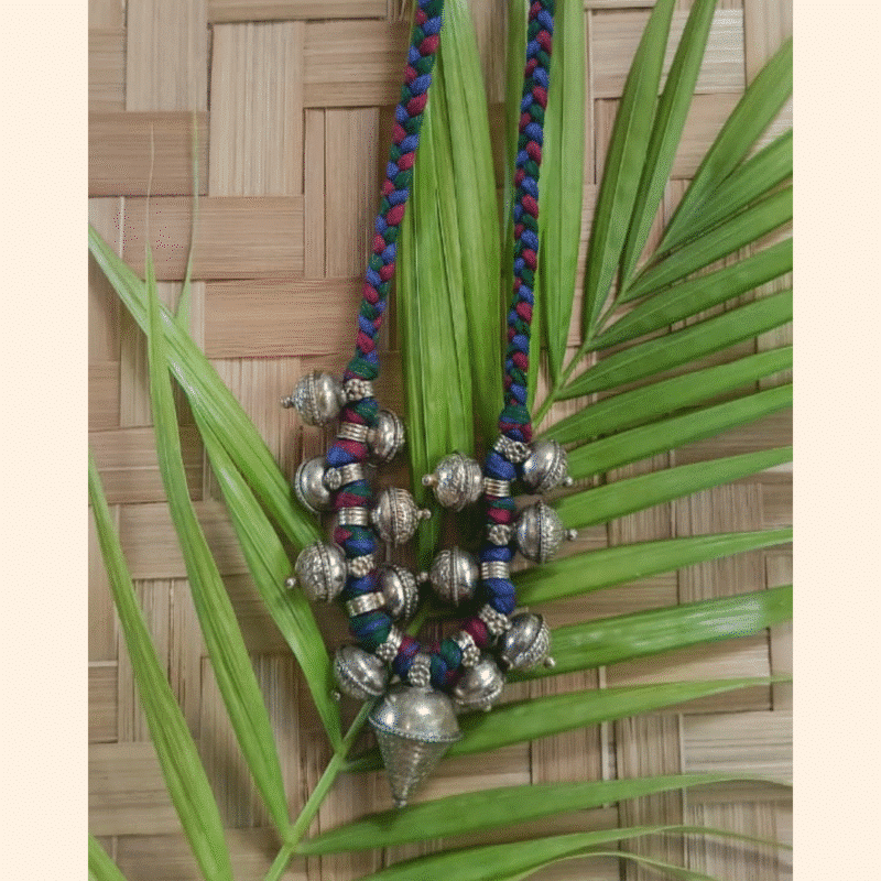 Step into traditional elegance with this Multicolour Shikar Haar (necklace), crafted with a refined blend of silver and copper for an antique, artisanal finish. Clusters of textured metal beads are strung along a rich red, blue and green braided cord, adding dramatic volume and depth. A distinctive conical pendant accentuates its bold tribal appeal, while the detailed craftsmanship lends a rustic, timeless charm.