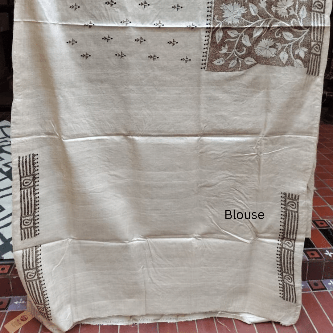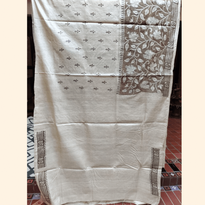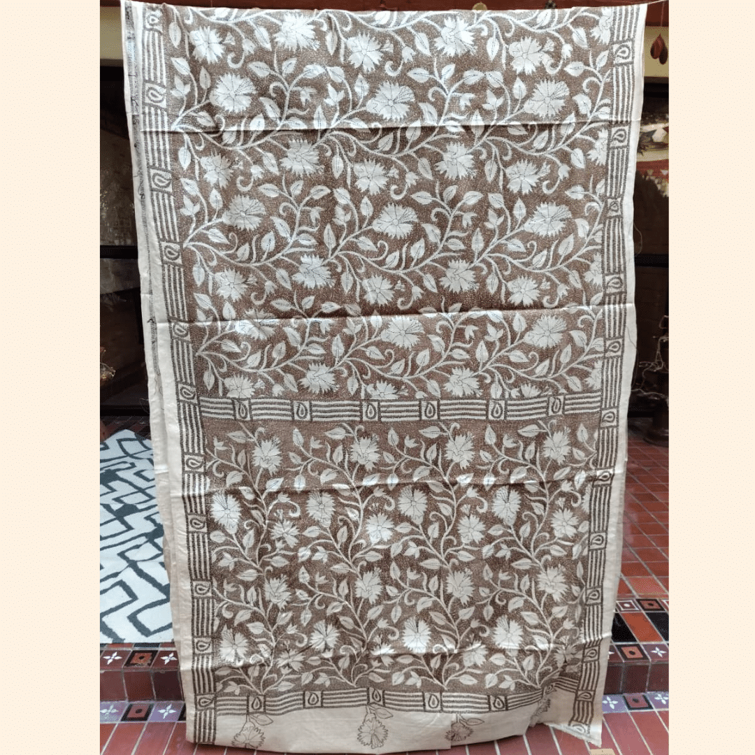 Tussar Silk Kantha Saree – Brown and Beige Floral