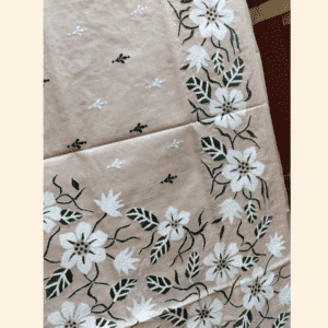 Elegant and evocative, this Tussar Silk Kantha Saree features a natural beige base brought to life by a cascading floral vine. The design showcases large, hand-embroidered white blossoms intertwined with black foliage, creating a fluid, organic movement across the fabric. The intricate Kantha stitch adds a refined texture, making this piece a sophisticated choice for festive gatherings. The saree comes with an embroidered blouse piece.