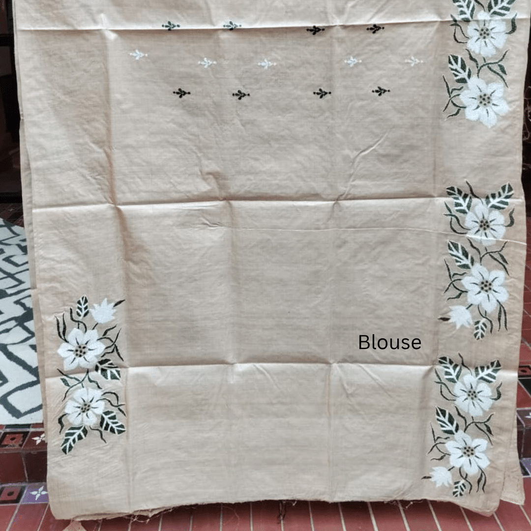 Tussar Silk Kantha Saree – Beige with White and Black Floral