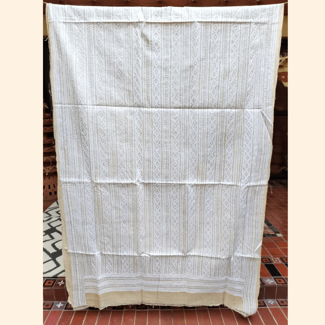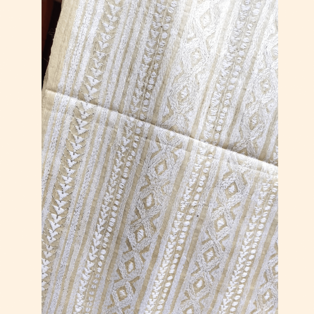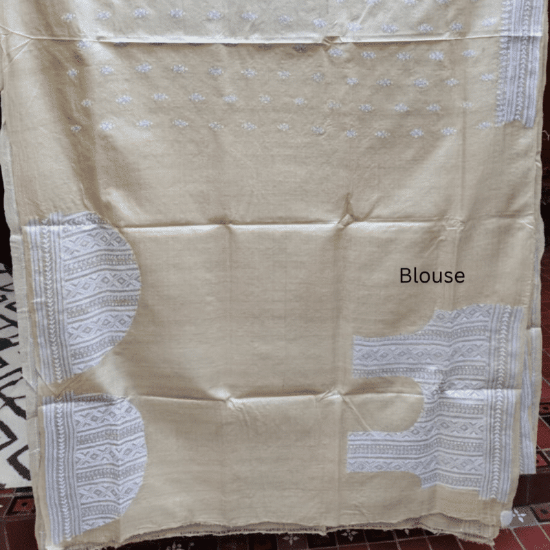 This Tussar Kantha Silk Saree features a natural beige base defined by precise and dense white embroidery. The aanchal is composed of clean, vertical bands of geometric motifs and rhythmic linear patterns,. The body is elegantly understated, featuring scattered geometric butis, while the borders are framed by simple, tiered linear stripes. The saree comes with a matching embroidered beige blouse piece.