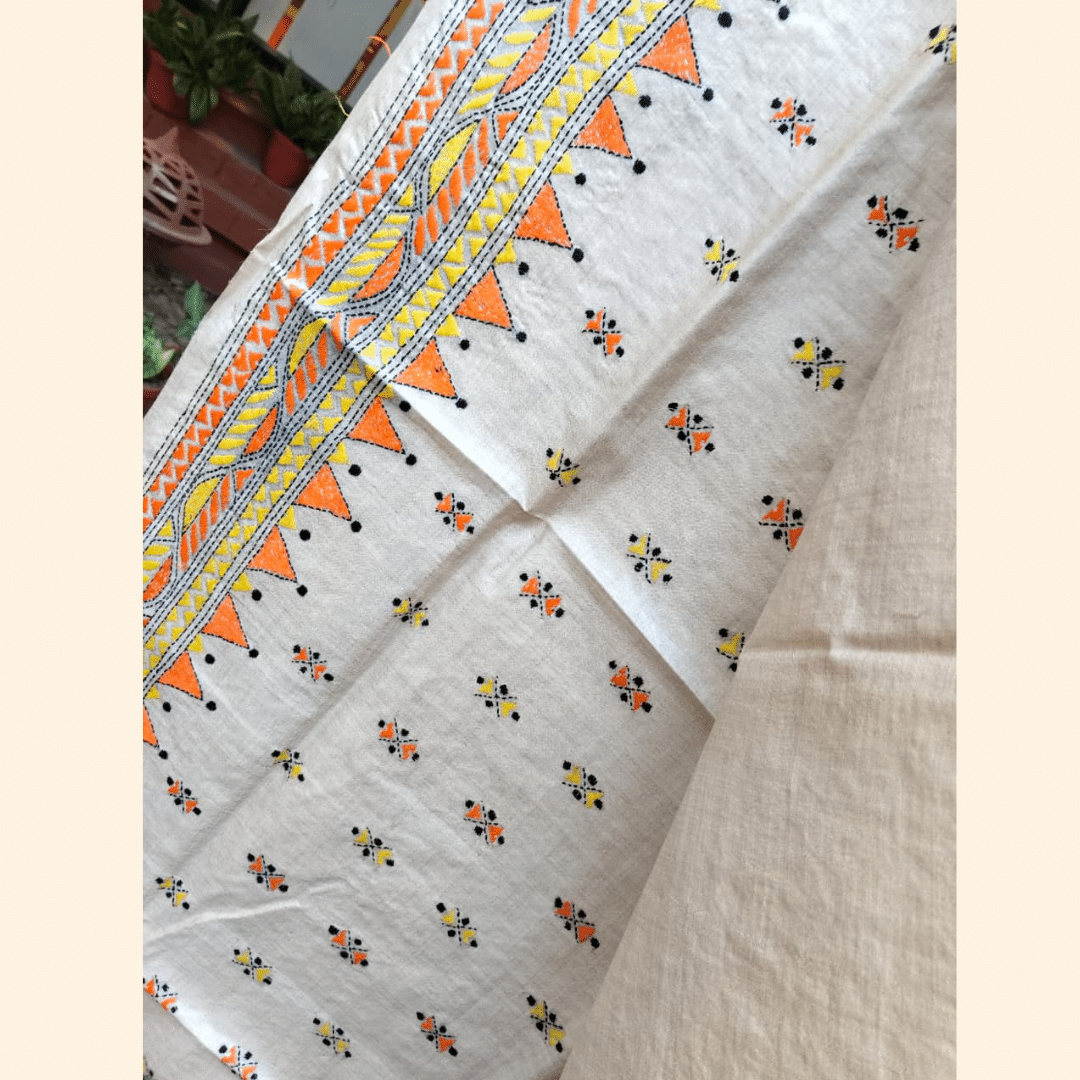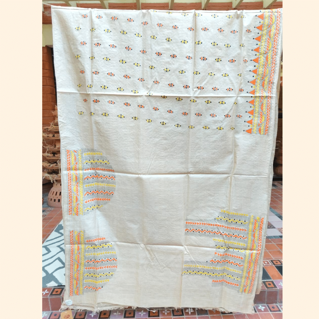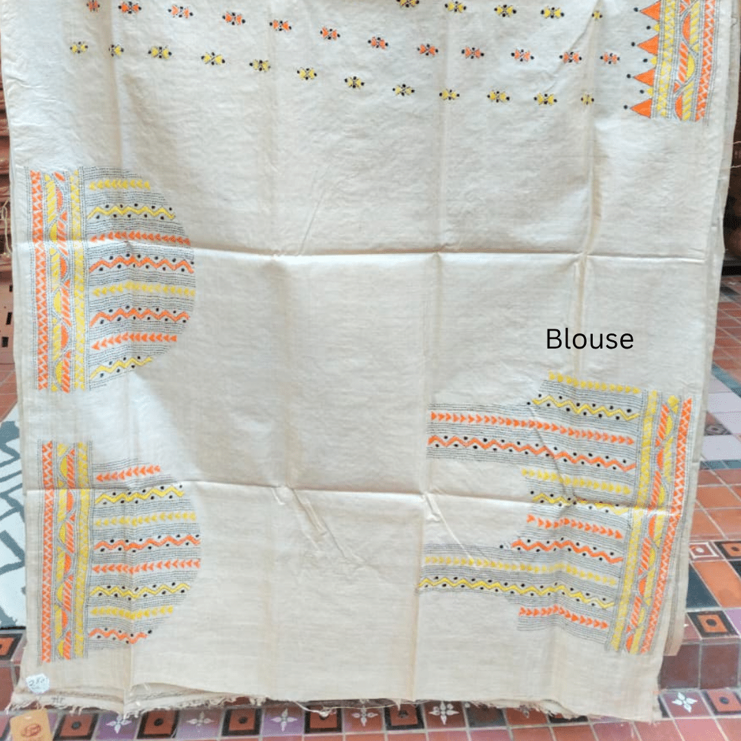 Tussar Silk Kantha Saree – Beige with Yellow, Orange and Black