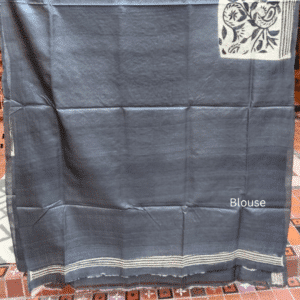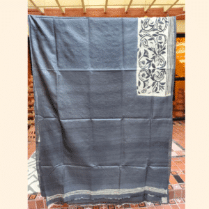 Serene and exquisitely detailed, this Tussar Silk Kantha Saree is a masterful display of traditional geometric and floral artistry. The saree features a calm steel blue body framed by a dense, hand-stitched beige and black border that carries into a magnificent aanchal. The design showcases a sophisticated mix of circular mandalas, sharp geometric diamonds, and a central band of flowing floral and bird motifs, all rendered with thousands of tiny, precise Kantha stitches. This rich, textured finish celebrates the meticulous heritage of West Bengal’s craft in a modern, muted palette.