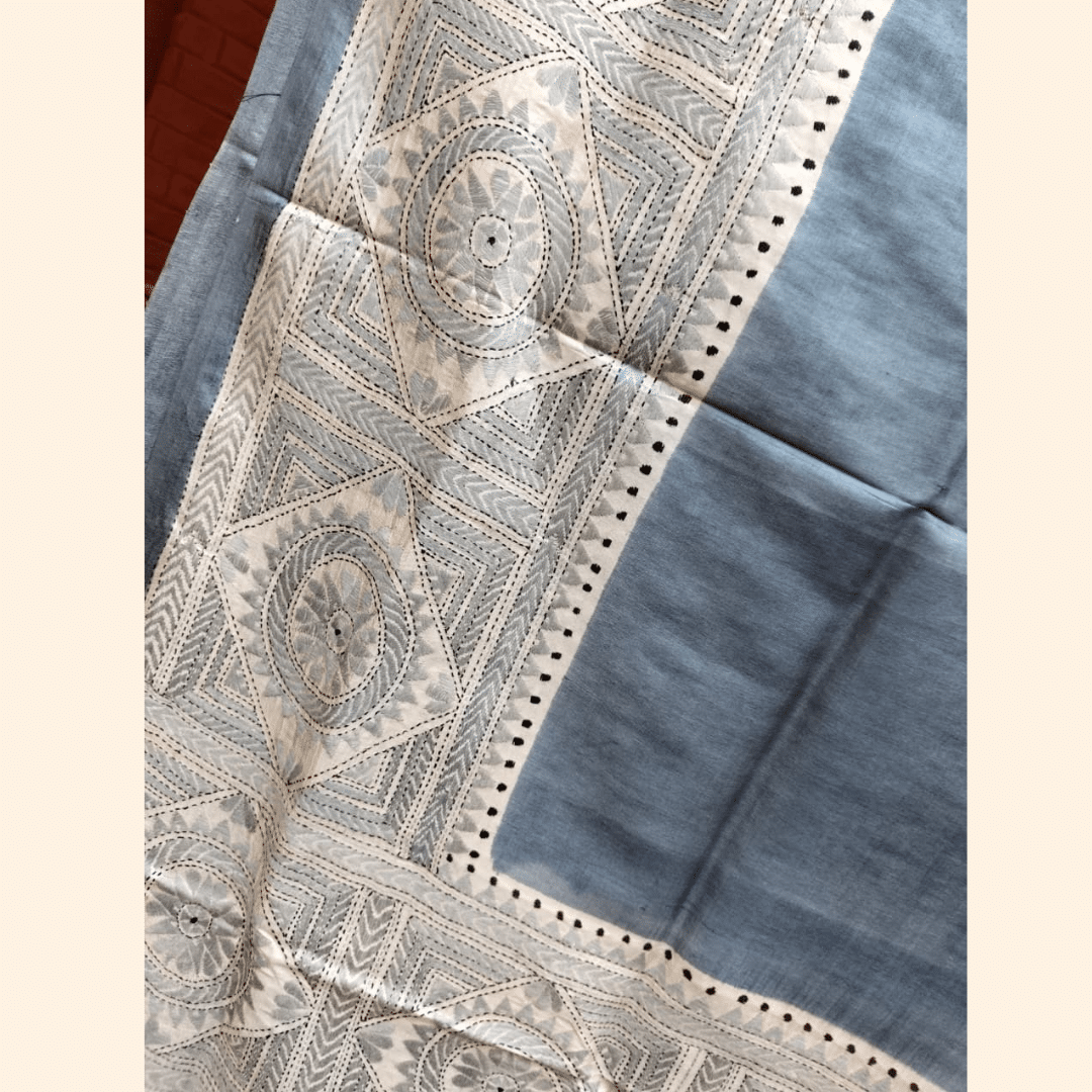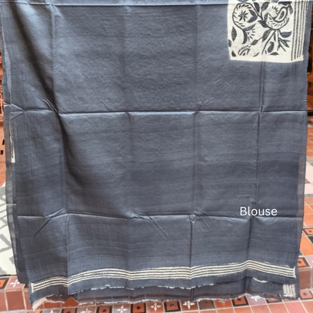 Tussar Silk Kantha Saree – Blue and Beige