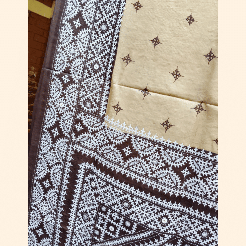 Tussar Silk Saree with Gujarati Stitch – Beige with Dark Brown and White