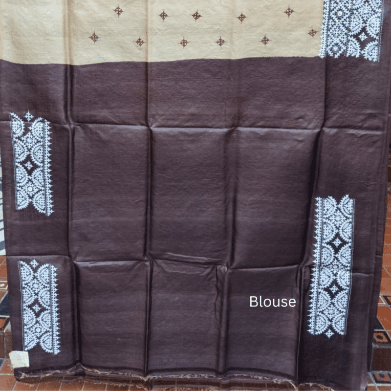 Understated and elegant, this Tussar silk saree has a natural beige body adorned with small brown motifs arranged in a delicate repeat. The rich brown border and aanchal feature intricate white geometric Gujarati stitch, adding visual texture. The saree comes with a brown blouse piece with white embroidery.