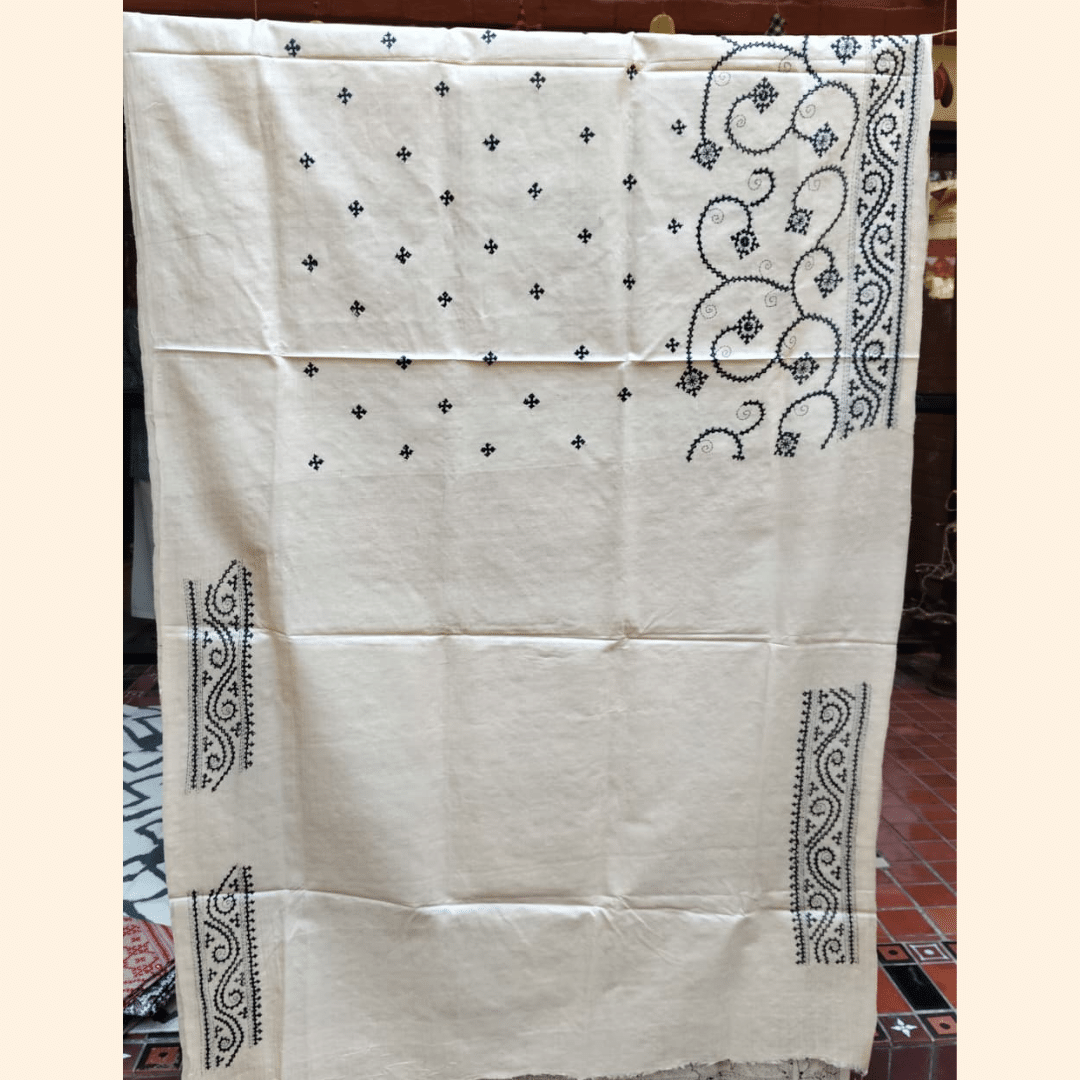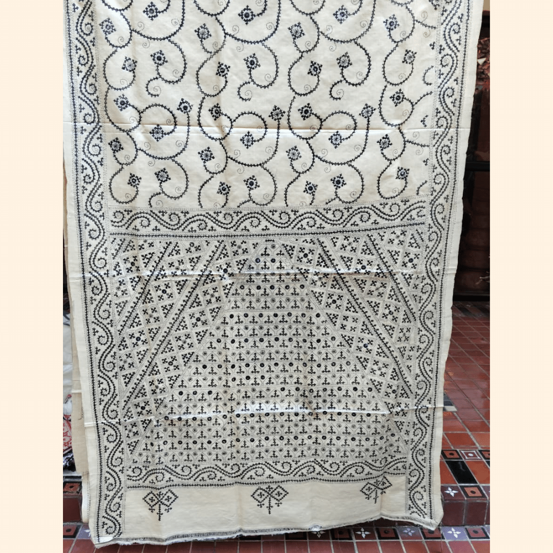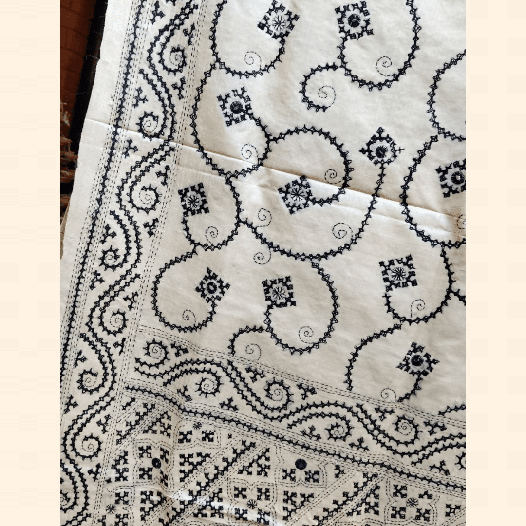 • Design: Flowing vine and geometric patterns in Gujarati stitch