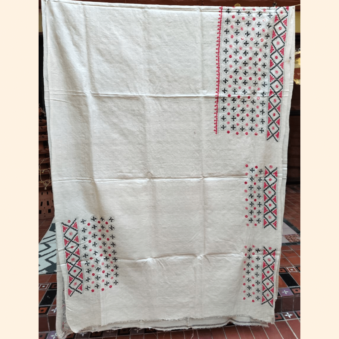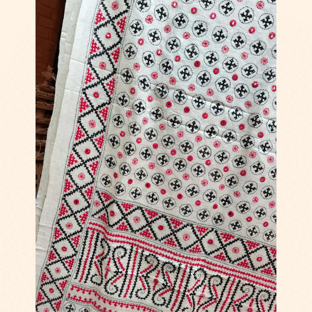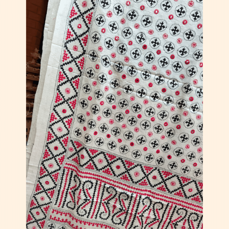 Striking yet refined, this Tussar silk saree features an ivory base enlivened with delicate black motifs and subtle red accents. The body is patterned with small circular floral forms arranged in a rhythmic repeat, creating a balanced and lively texture. The borders are defined by bold diamond motifs highlighted with red, while the pallu showcases structured panels of geometric and vine-inspired designs that add depth and visual interest.