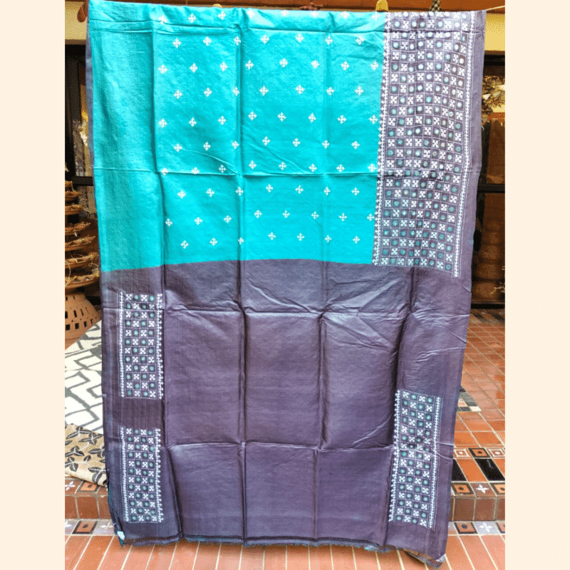Be the first to review “Tussar Silk Saree with Gujarati Stitch – Teal with Charcoal and White”