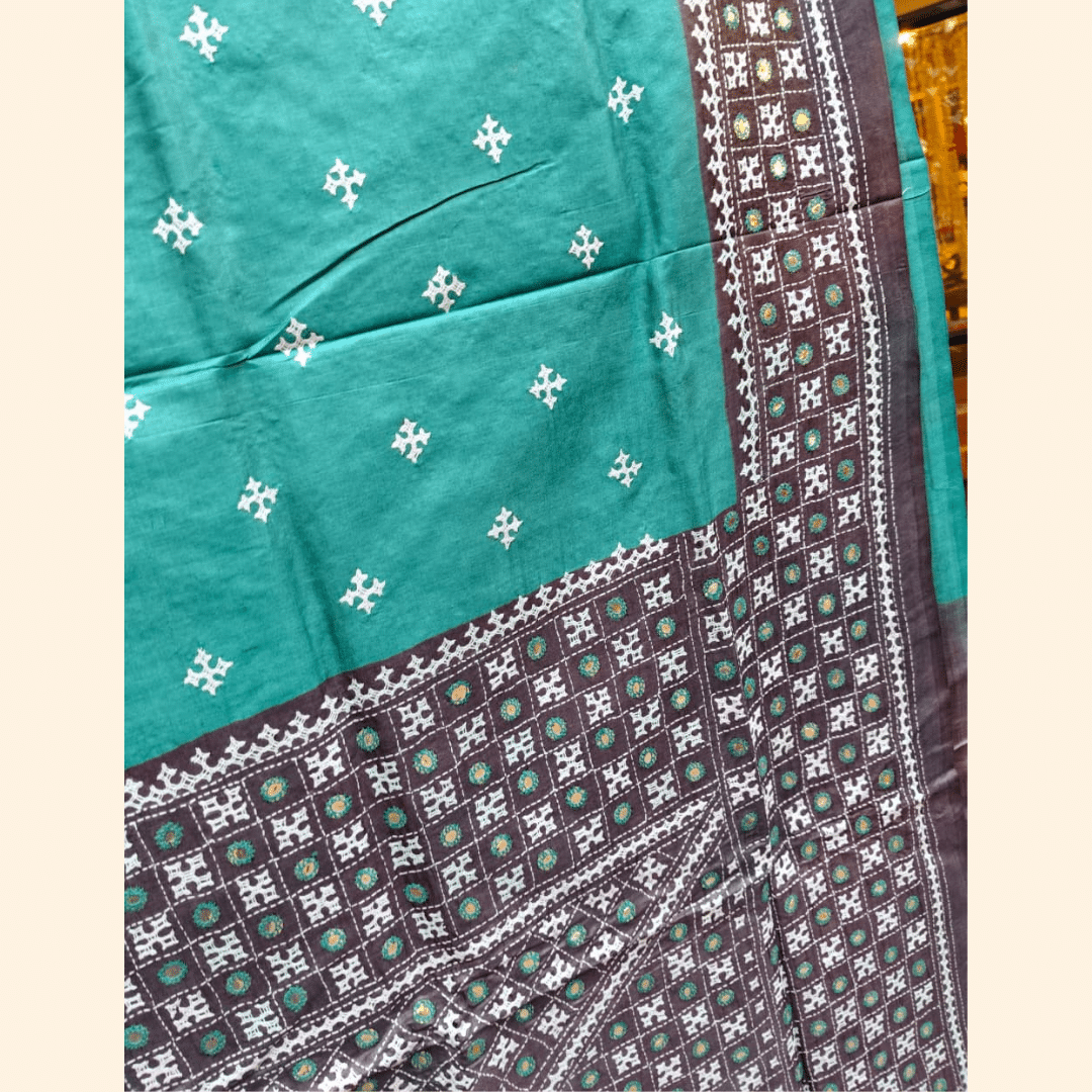 Tussar Silk Saree with Gujarati Stitch – Teal with Charcoal and White