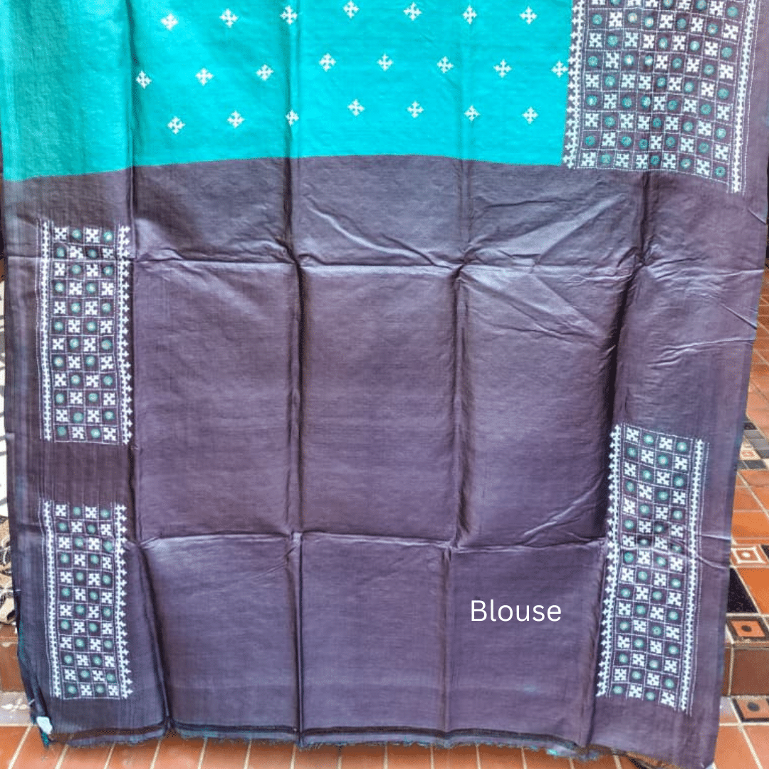 Striking yet refined, this Tussar silk saree pairs a vibrant teal body with intricate Gujarati stitch. The teal body is dotted with small white motifs that create a rhythmic visual texture, while the border and aanchal feature a similar design in teal and white arranged in neat grids and diagonal layouts. The saree comes with a charcoal blouse piece with white embroidery.