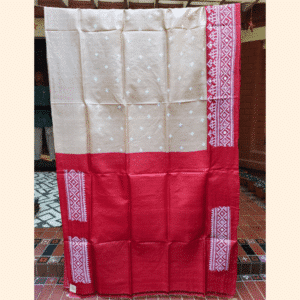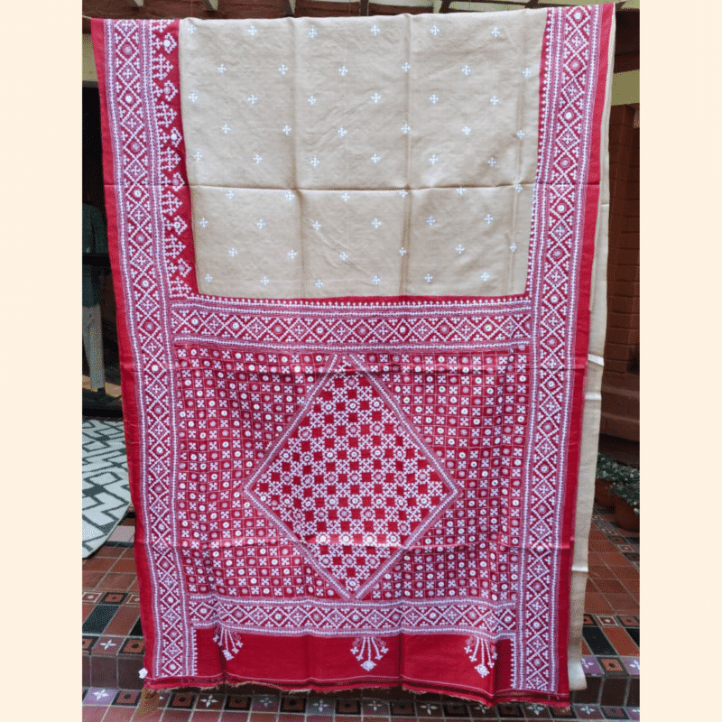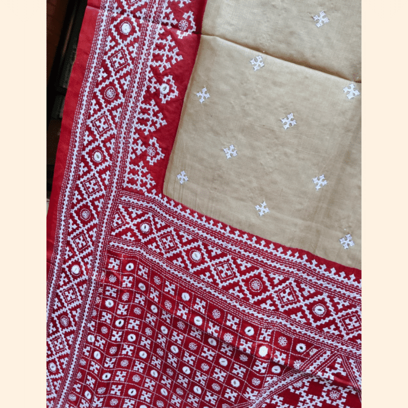 Timeless and elegant, this Tussar silk saree beautifully blends a soft beige base with subtle Gujarati stitch arranged in a delicate repeat. The rich red border and aanchal feature intricate white embroidery, forming dense geometric patterns with a striking central diamond motif that adds depth and character to the saree. The saree comes with a red blouse piece with white embroidery.
