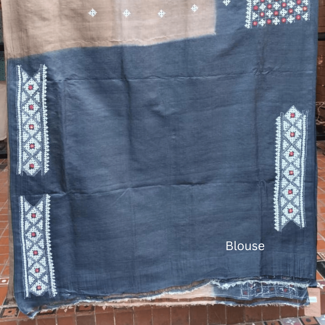 Understated and elegant, this Tussar silk saree highlights the beauty of earthy tones accentuated with Gujarati stitch. The body features a sophisticated tri-color gradient of deep blue, taupe, and green, adorned with small white motifs arranged in a delicate repeat. The rich border and aanchal feature intricate white and red geometric Gujarati stitch, adding visual texture. The aanchal specially has a striking pattern in the centre which highlights the design. The saree comes with a blue blouse piece with white embroidery.