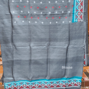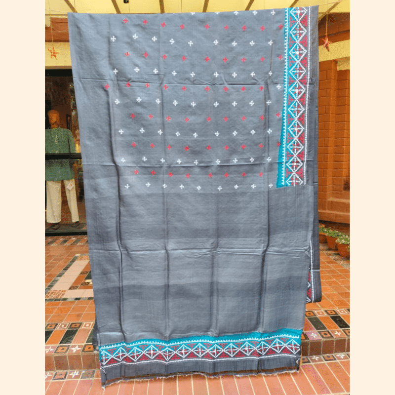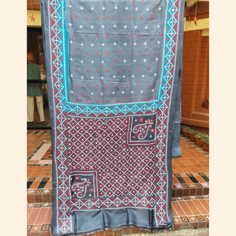 Be the first to review “Tussar Silk Saree with Gujarati Stitch – Grey with Teal, Red and White”