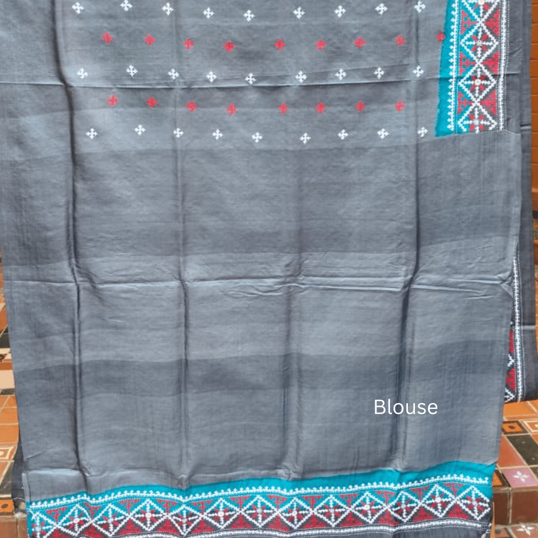 Tussar Silk Saree with Gujarati Stitch – Grey with Teal, Red and White