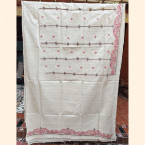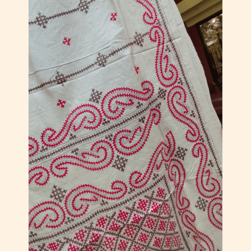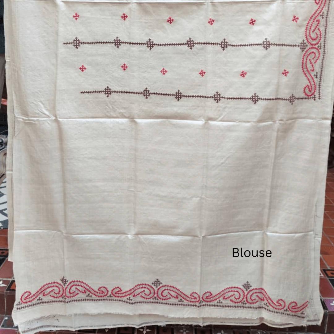 Understated and elegant, this Tussar silk saree highlights the beauty of subtle contrast and traditional pattern. The white body is adorned with small red and dark brown motifs arranged in a delicate repeat, creating a refined and balanced look. Intricate borders and aanchal feature a blend of geometric and swirling vine patterns in red and brown Gujarati stitch.The saree comes with a matching blouse piece with embroidery.