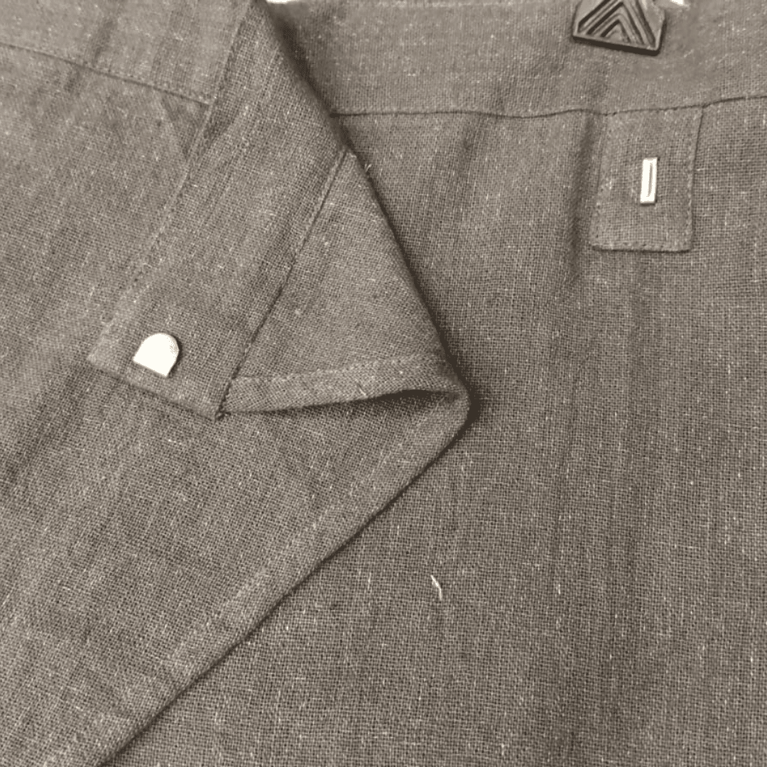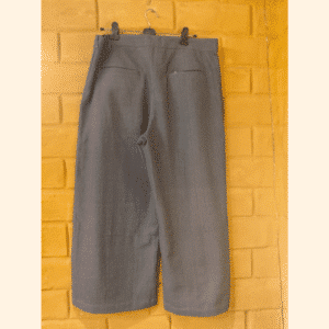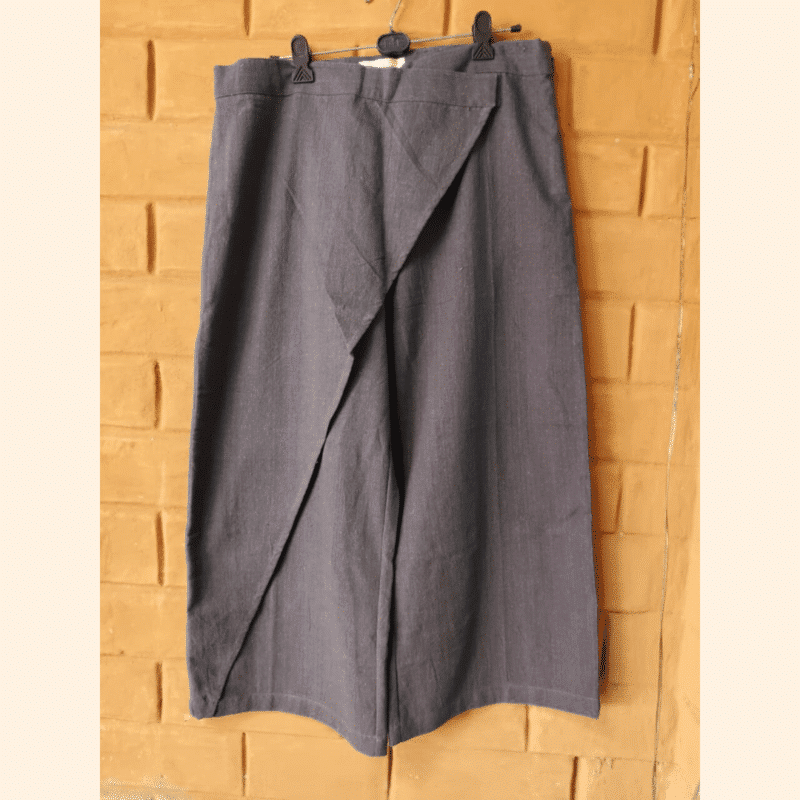 Tailored in a deep charcoal hue, this Wrap Pant is crafted from breathable khadi cotton fabric with a soft, slightly textured finish. The distinctive wrap-over front panel creates a layered silhouette that adds structure while allowing ease of movement. Designed with a clean waistband, concealed fastening, side zip and two functional back pockets, it balances comfort with understated style. Falling at a relaxed cropped length it is ideal for everyday wear with a contemporary edge.
